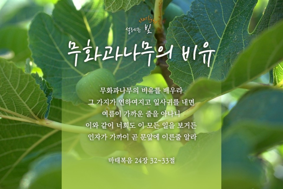 제자들이 예수님께 재림하실 때의 징조를 여쭈었을 때(마 24장 3절) 예수님꼐서는 "무화과나무의 비유를 배우라"고 말씀하셨습니다. 재림 그리스도가 오시는 시기를 올바르게 이해하려면 무화과나무의 비유와, 그것을 통해 알려주시는 징조를 분명히 알아야 합니다.