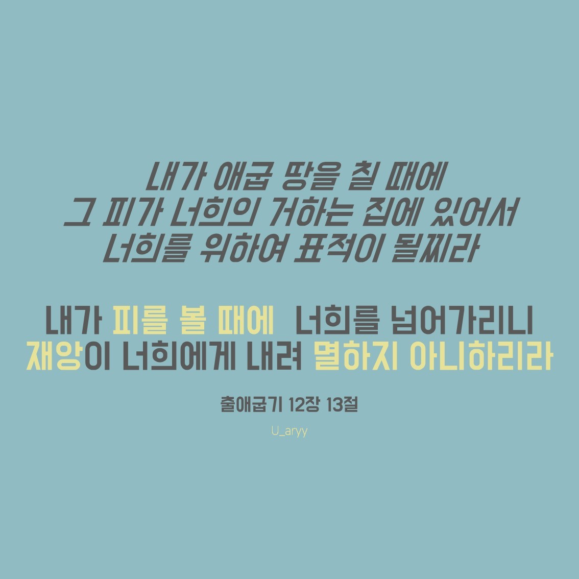 이니라... 내가 피를 볼 때에 너희를 넘어가리니 재앙이 너희에게 내려 멸하지 아니하리라 너희는 이날을기념하여 여호화의 절기를 삼아 영원한 규례로 대대세 지킬지니라"