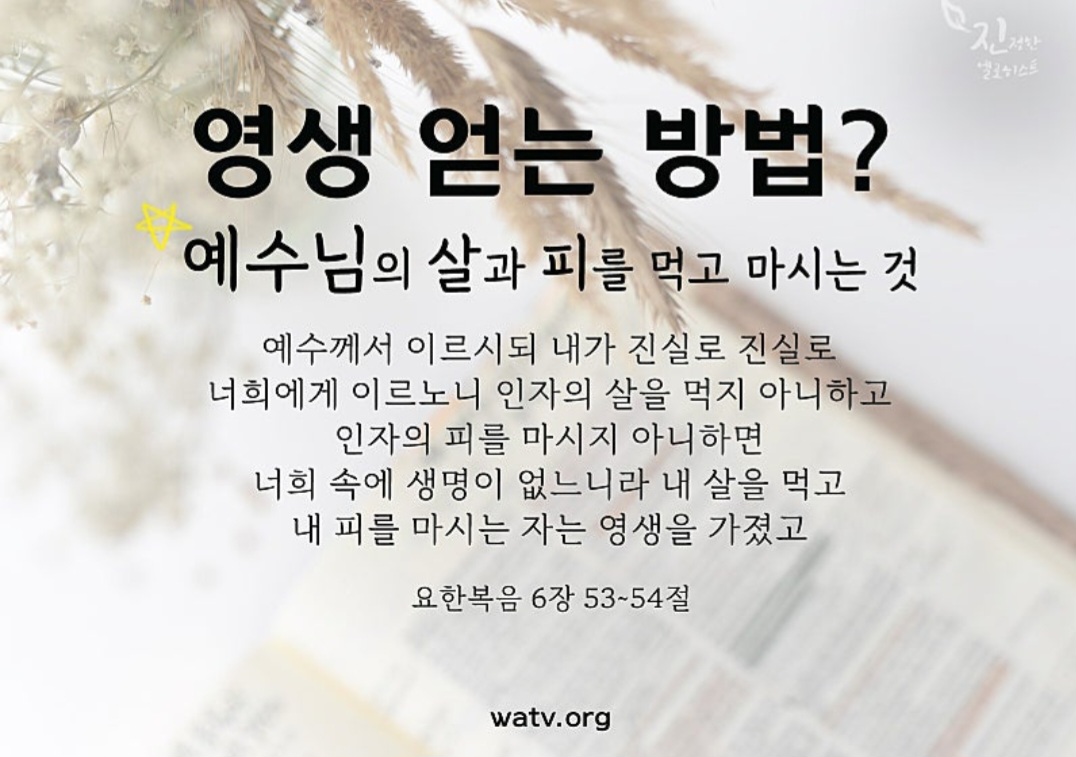요한복음 6장 53~54 "예수께서 이르시되 ... 내 살을 먹고 내 피를 마시는 자는 영생을 가졌고"
