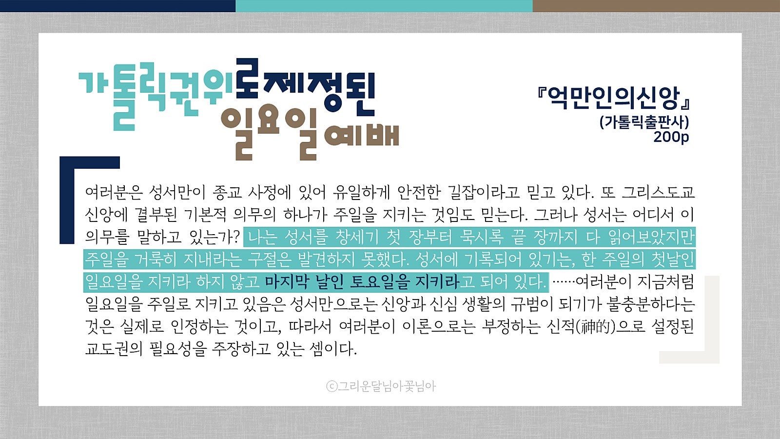 “성서의 안식일은 토요일이지 일요일은 아니다.” (교부들의 신앙: 카톨릭출판사)