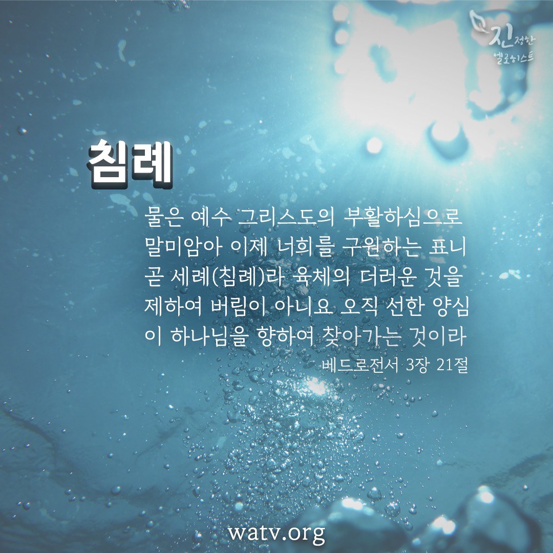 베드로전서 3장 21절 "물은 예수 그리스도의 부활하심으로 말미암아 이제 너희를 구원하는 표니 곧 세례라 육체의 더러운 것을 제하여 버림이 아니요 오직 선한 양심이 하나님을 향하여 찾아가는 것이라"