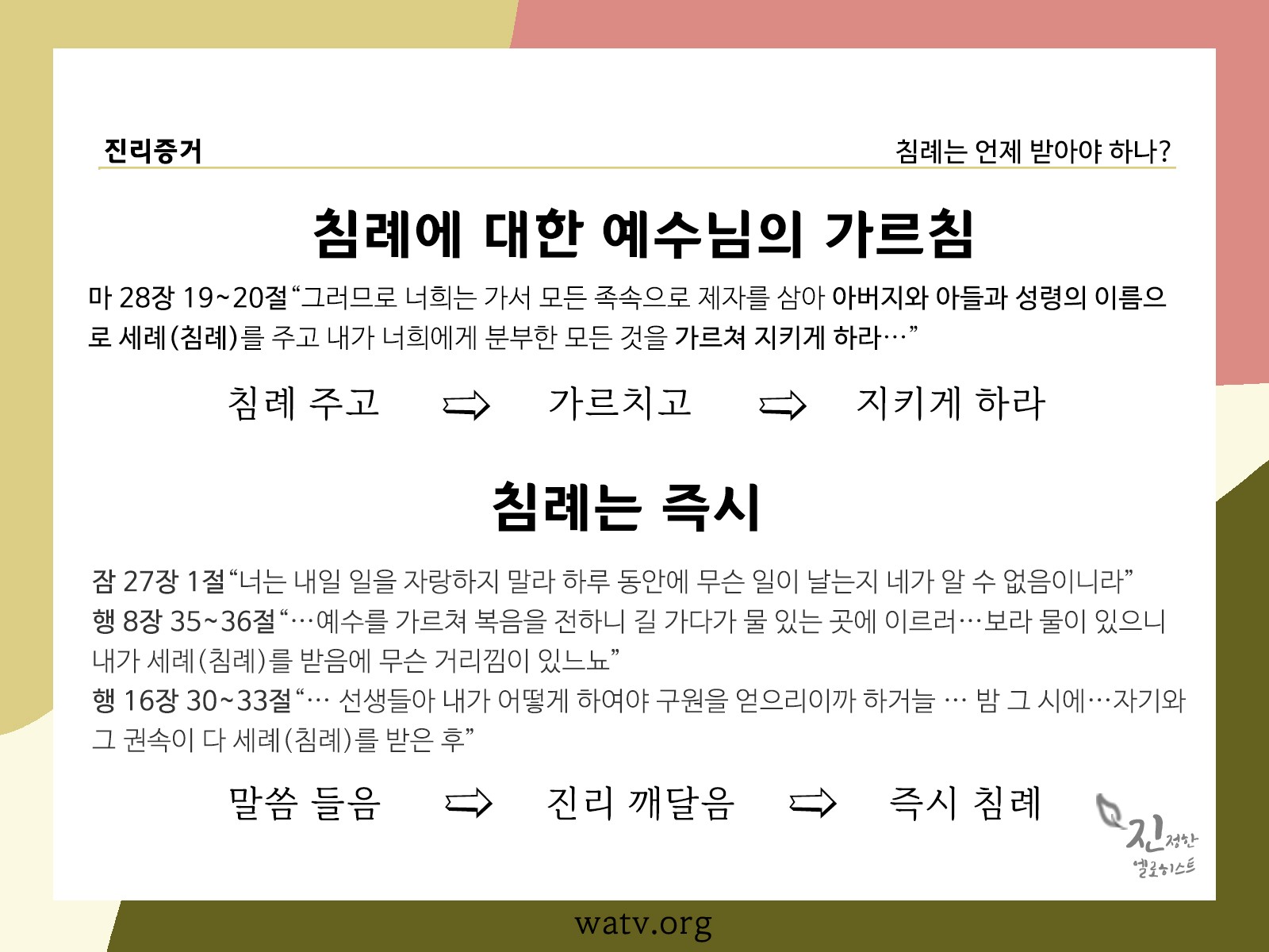 침례를 받고 가르치심을 시작하신 예수님께서는 사람들에게 침례를 베푸시는 본도 보이셨습니다. 하나님 보시기에 협당한 일이라 하시며, 예수님께서 친히 침례를 받으시고 베푸시는 본을 보이신 이유는 그 안에 인류를 구원에 이르게 할 귀한 진리가 담겨 있기 때문입니다.