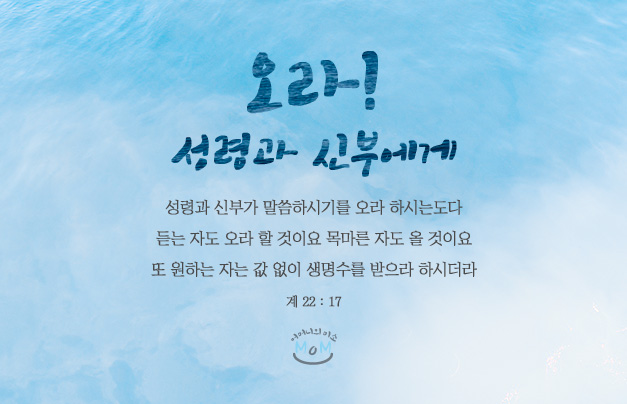 성령과 신부이신 아버지 어머니께서"오라, 와서 생명수를 받으라"고 말씀하고 계십니다. 우리가 아버지 어머니께 나아가기 위해서는 아버지 어머니의 존재도 알아야겠고, 우리에게 영원한 생명을 주실 수 있는 분이 아버지 어머니밖에 없다는 사실도 깨달아야겠습니다. 오직 성령과 신부께 나아갈 때 인류를 소성시킬 수 있는 생명수를 우리가 얻을 수 있습니다. 이 말씀을 결코 더하거나 빼지 말라 하셨습니다.